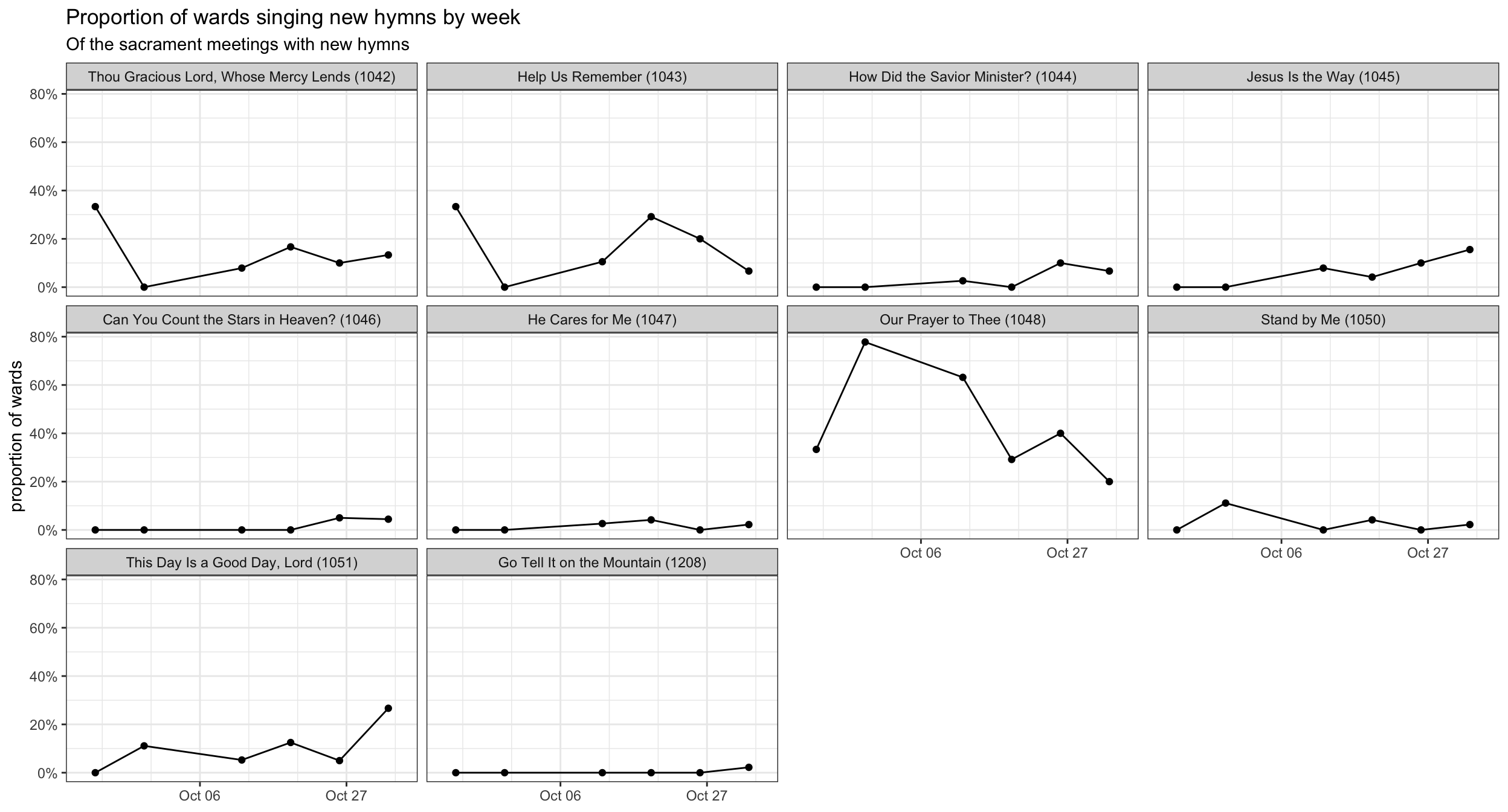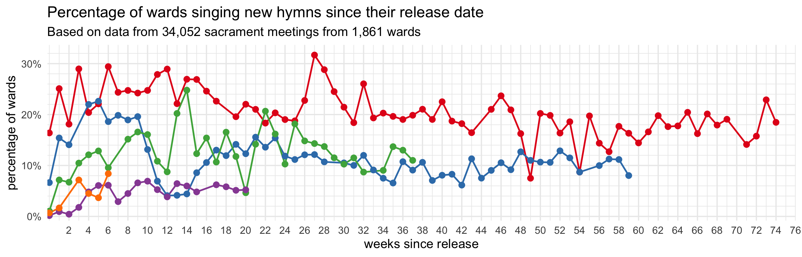 In this version of the plot, it’s easier to compare batches. Thanks to that post–General Conference surge, the fifth batch was nearly as popular as the third batch. But, the more recent slump is more easily seen here, to the point where fewer wards sang from it after five weeks than they did the fourth batch after five weeks.